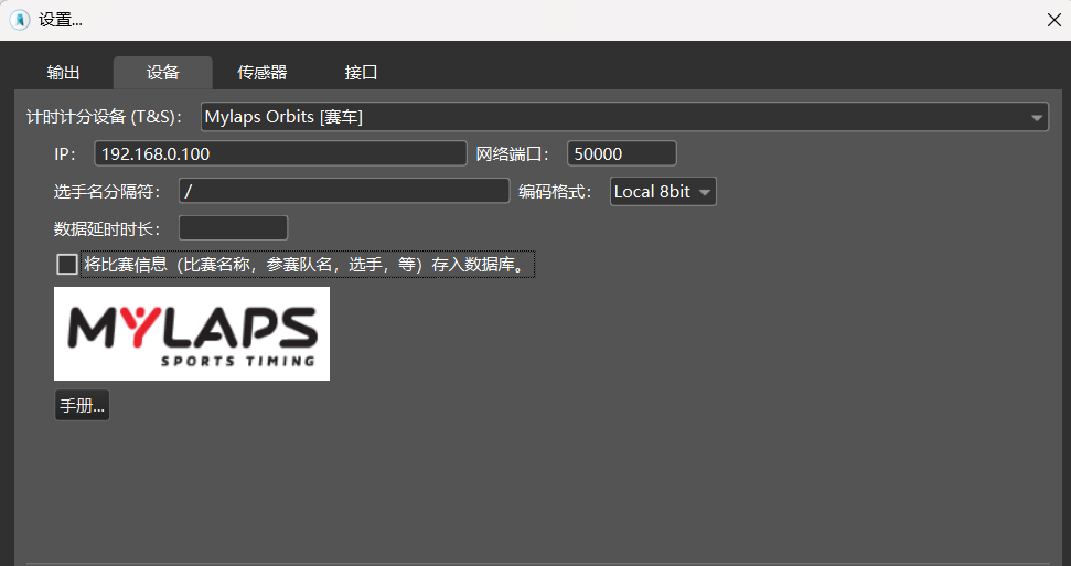 在 CICADA 中设置 Mylaps Orbits 的网络 IP 地址与端口,默认端口为 50000。