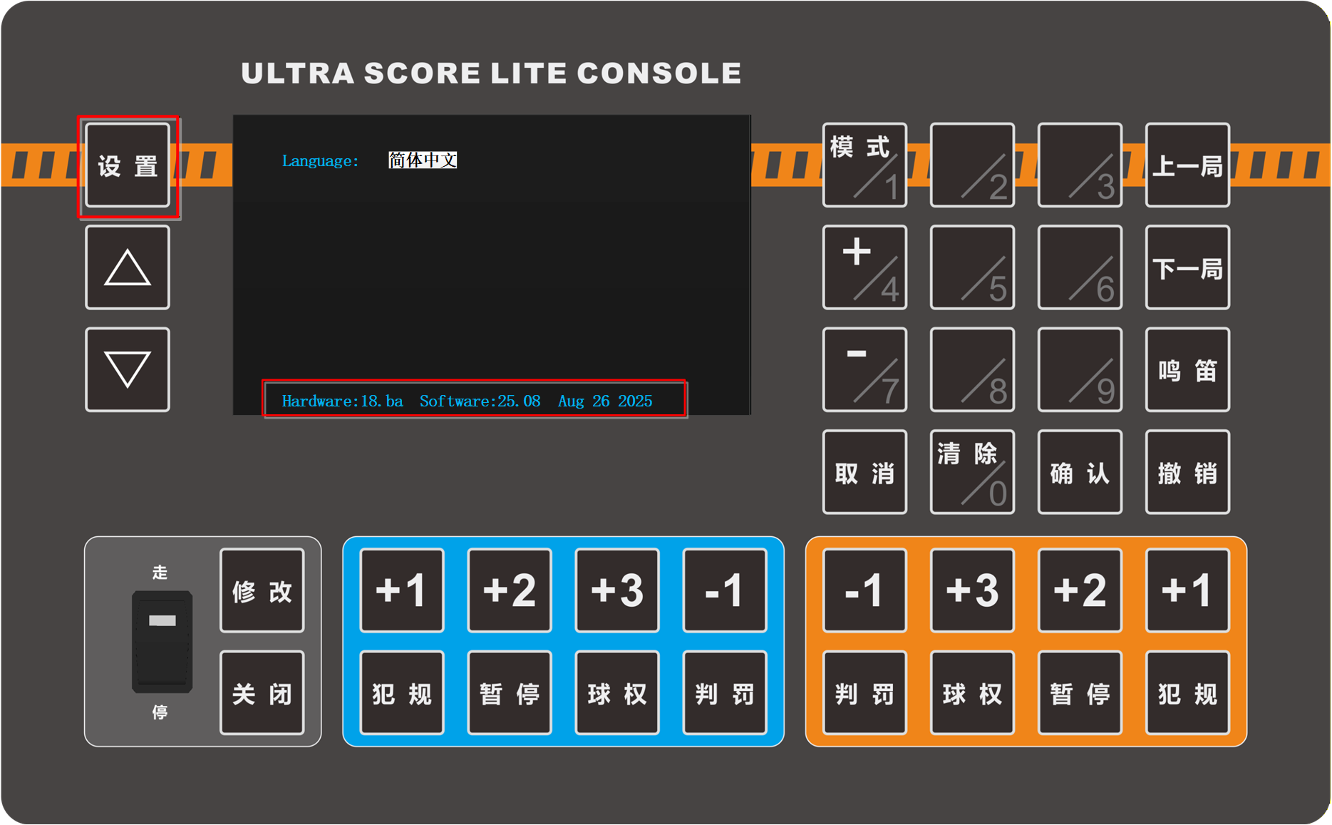 控制台升级完毕后会重新亮起,显示为计时记分界面。此时请关闭烧录软件,关闭控制台并重启,同时长按控制台的“设置”键,可检查升级后的版本信息。