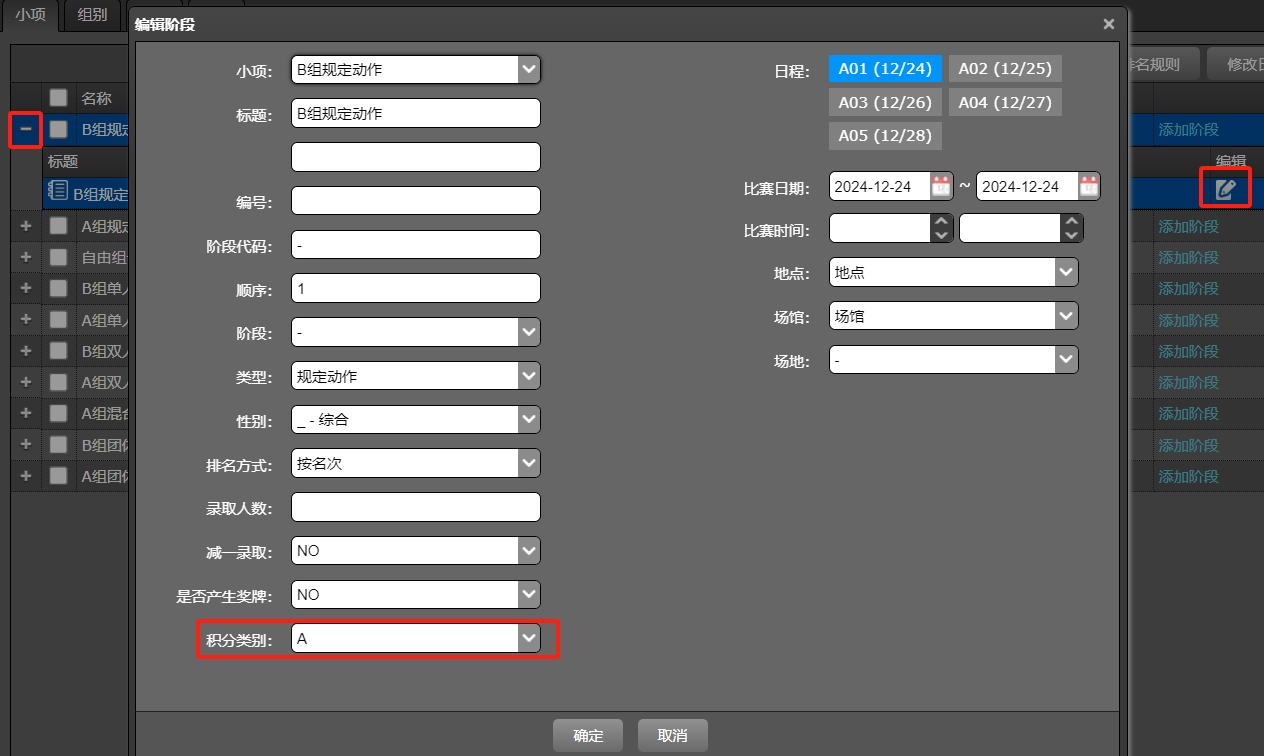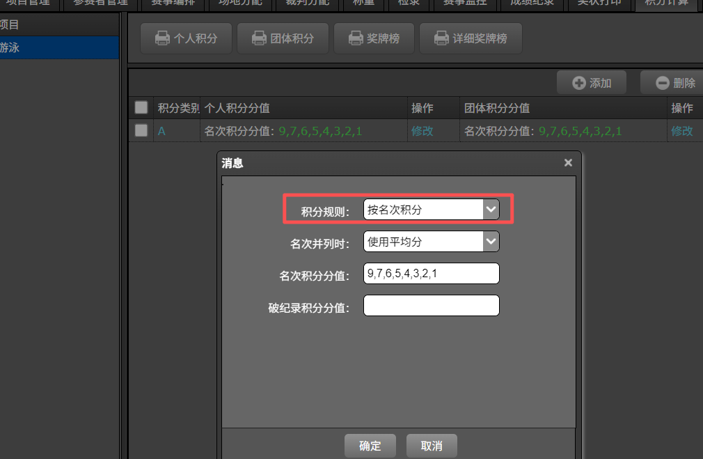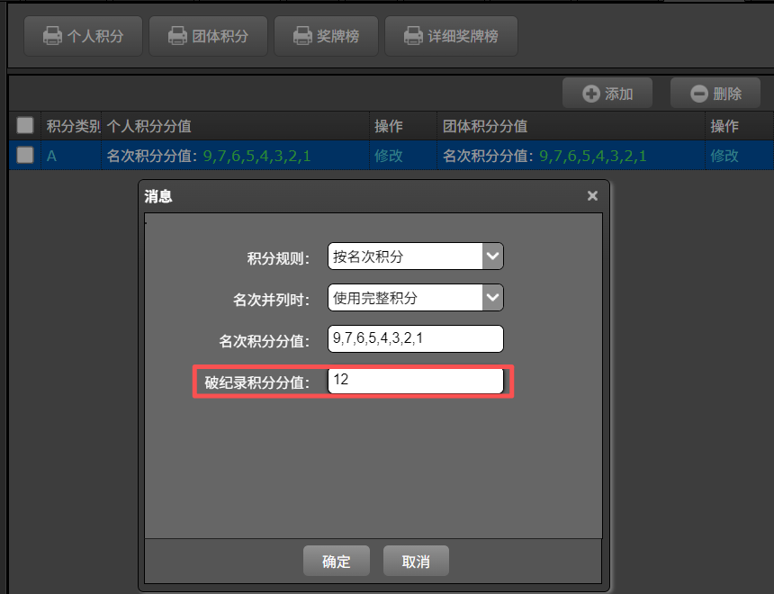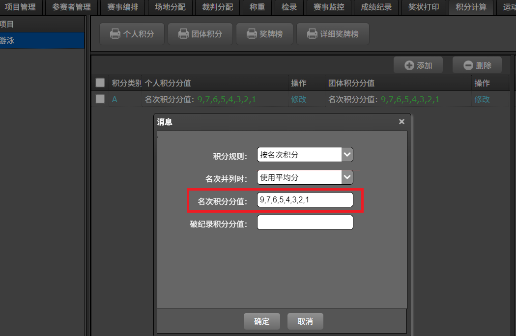 分别在个人积分和团体积分的积分分值中输入分值,用逗号分隔。比如球类或重竞技项目中,如果是单败淘汰赛,要求“第一名9分,第二名7分,第三名6分,第五名5分等等“