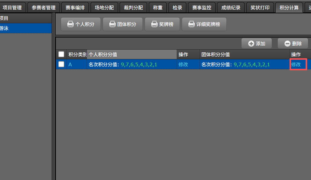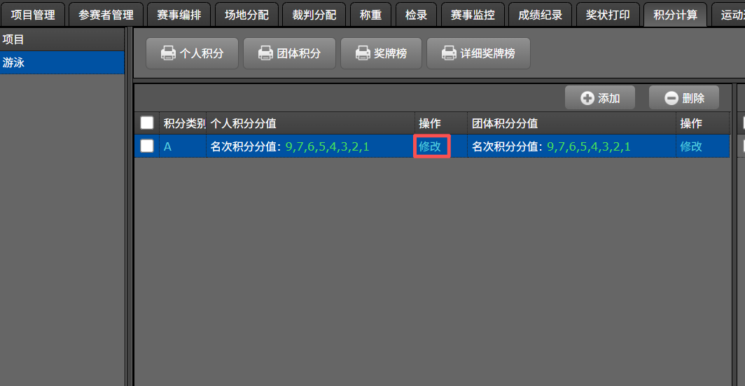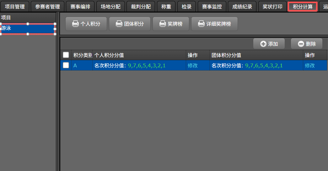 系统已自带一条积分规则信息,一般情况可以直接对其进行修改,以符合本次赛事的积分要求。如果需要,也可以建立多条积分规则,以针对不同年龄组或不同人数的项目进行不同积分的计算。