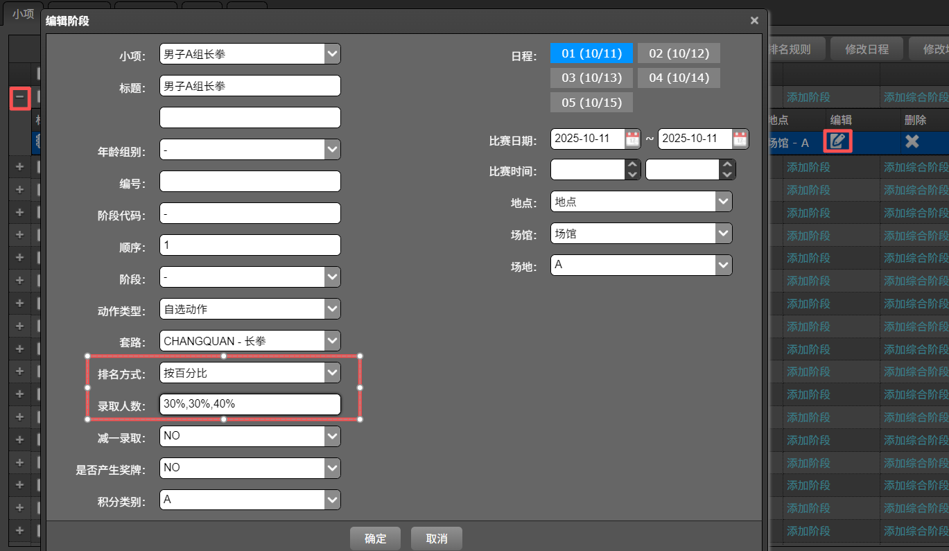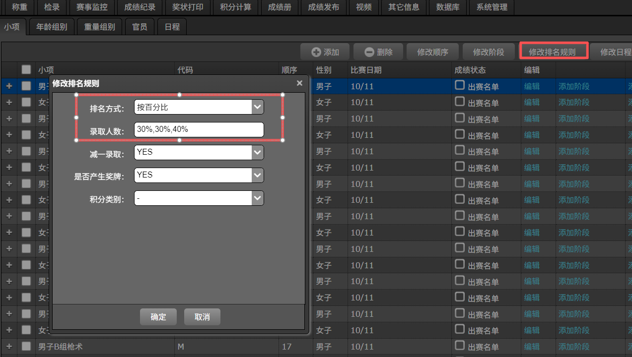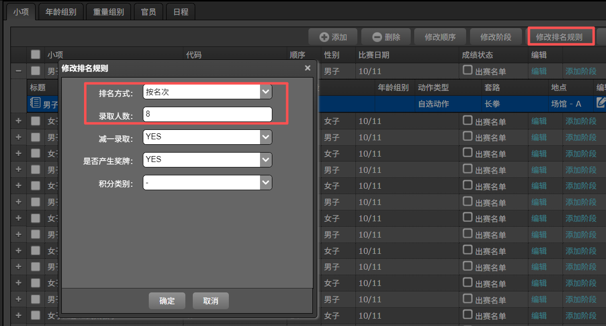 如针对单个小项修改,点击小项前“+”,并点击编辑按钮。选择“按名次”时,在录取人数栏输入录取选手的数量(比如:录入8人,直接输入8)。超出指定名次数值的名次都不会显示。
